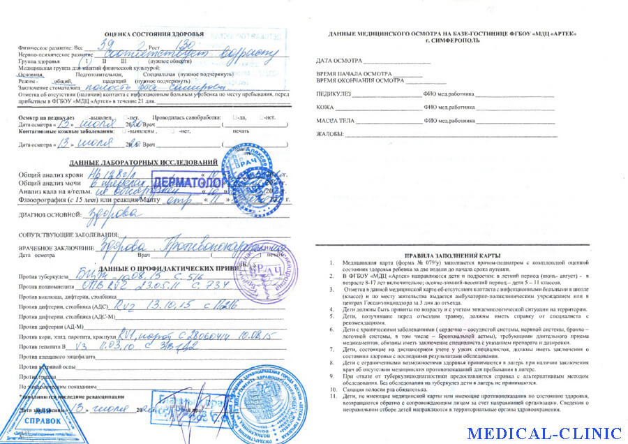 Важно также отметить выявленные аллергические реакции. Чтобы купить справку в Артек формы 159/у-02 можно обратиться в частную или государственную поликлинику. Там врач, сделает выписку из амбулаторной карты о болезнях, а также направит на анализы.