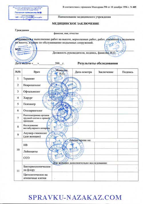 Справка для работы на высоте по форме 405 - Москва
