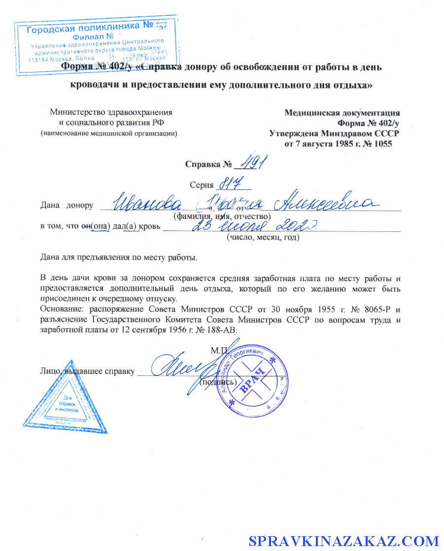 Купить справку донора в Москве формы 402 у
