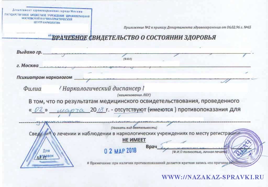 Чтобы получить нужную резолюцию можно не выходить из дома. Вам нужно всего лишь позвонить нашим операторам и оставить заявку. Купить справку от нарколога в Москве с печатями и подписями можно за несколько часов. От вас потребуется только указать информацию для заполнения бланка.
