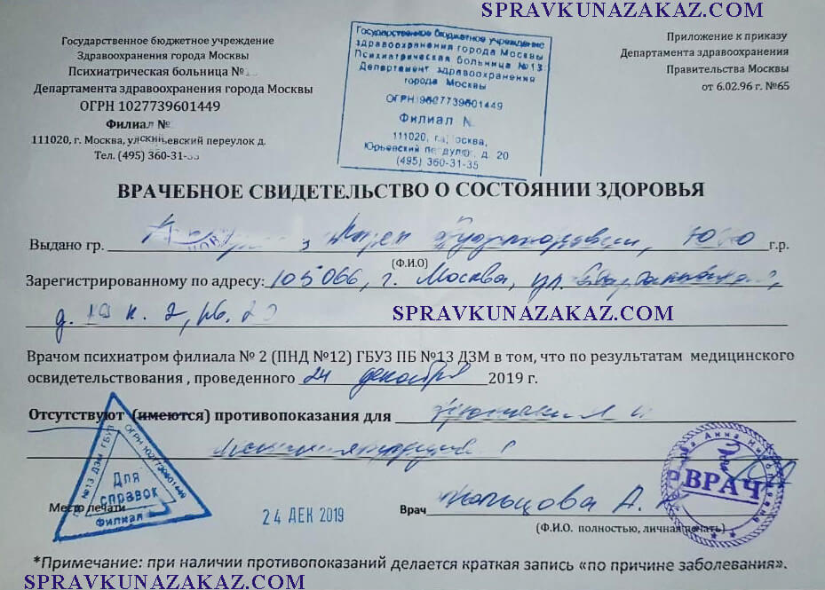 Купить справку из психоневрологического диспансера в Москве с доставкой срочно