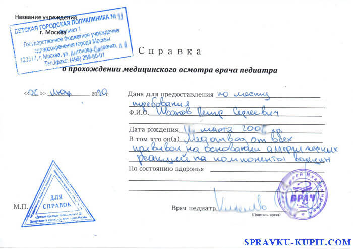 Купить справку медотвод от прививок в Москве недорого