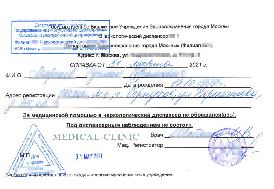 Из всех диспансеров Москвы: Получить по месту прописки: Оформления в течении несколько часов: Бесплатная доставка по кольцевой ветки метро: