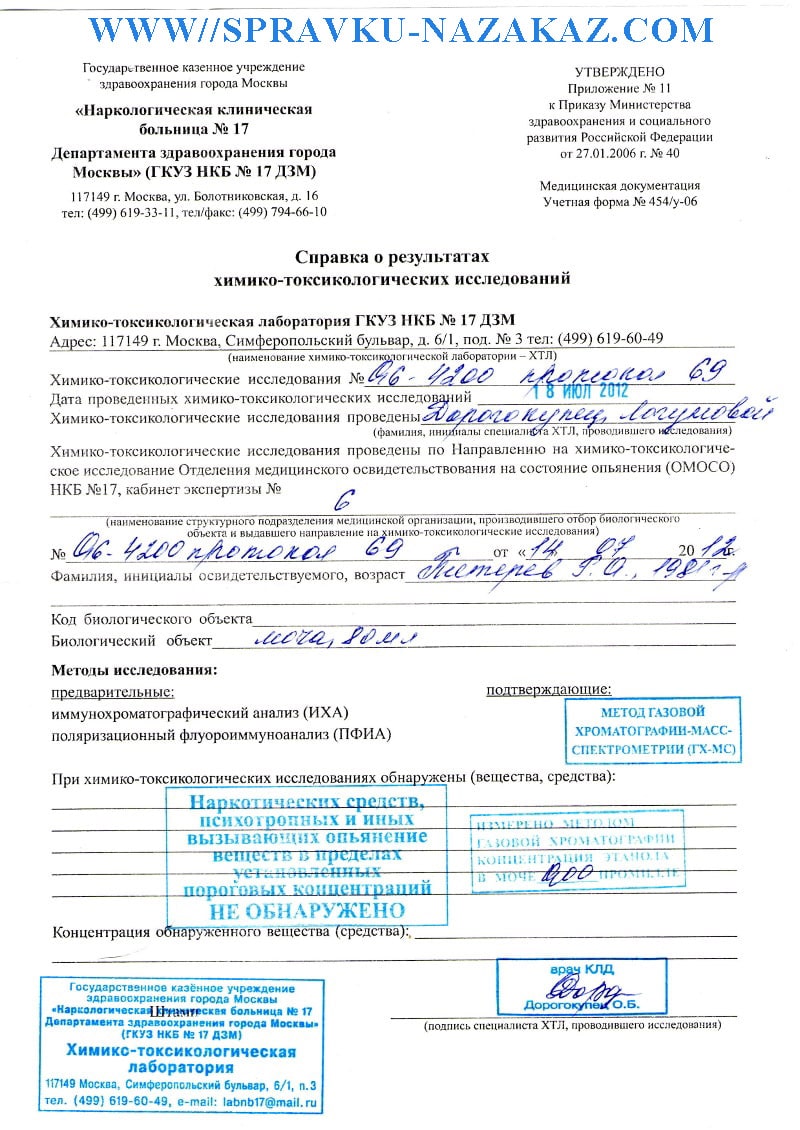 Купить справку химико токсикологической экспертизы в Москве