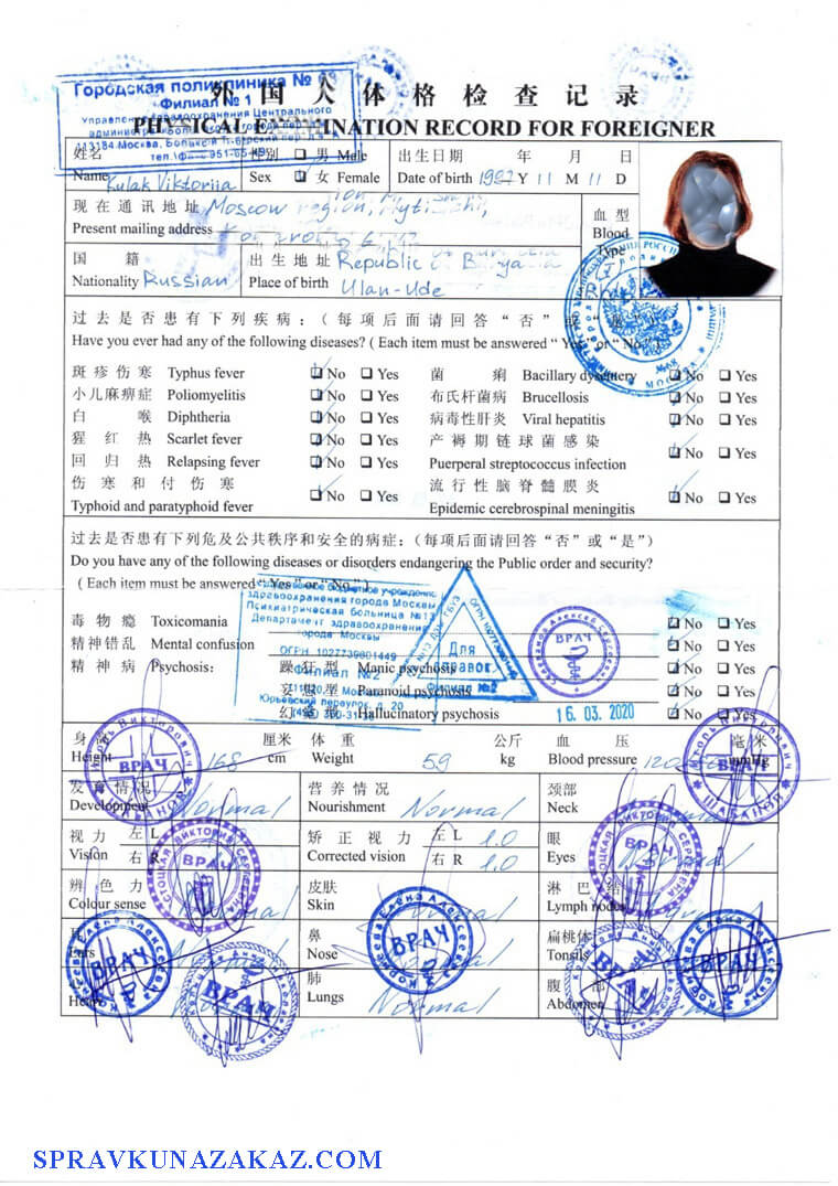 Туда же вносят данные про рост, вес, цвет глаз пациента, сведения о пройденной флюорографии и ЭКГ. Также желающие оформить справку в Китай сдают анализ крови, мочи, проверяются на СПИД и сифилис.