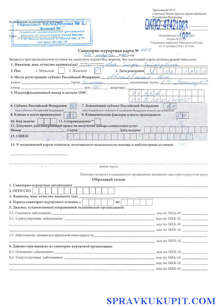 Купить санаторно курортную карту 072 у-04 в Москве срочно